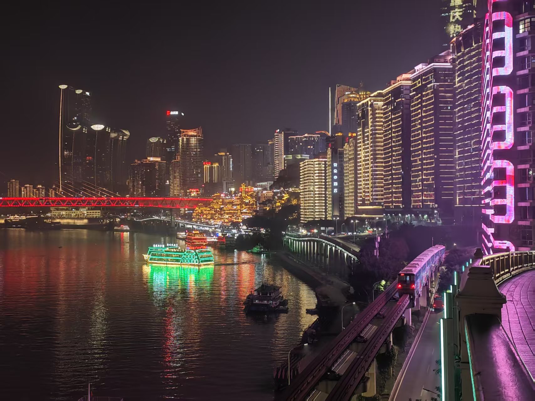 但是人巨多,大家都没什么心情在里面逛,只好溜出来沿着江边走了一道,过了一个大桥然后坐地铁回酒店了,江景还是很不错的。路上还领略了一下山城的迷路属性。差点看不懂导航。